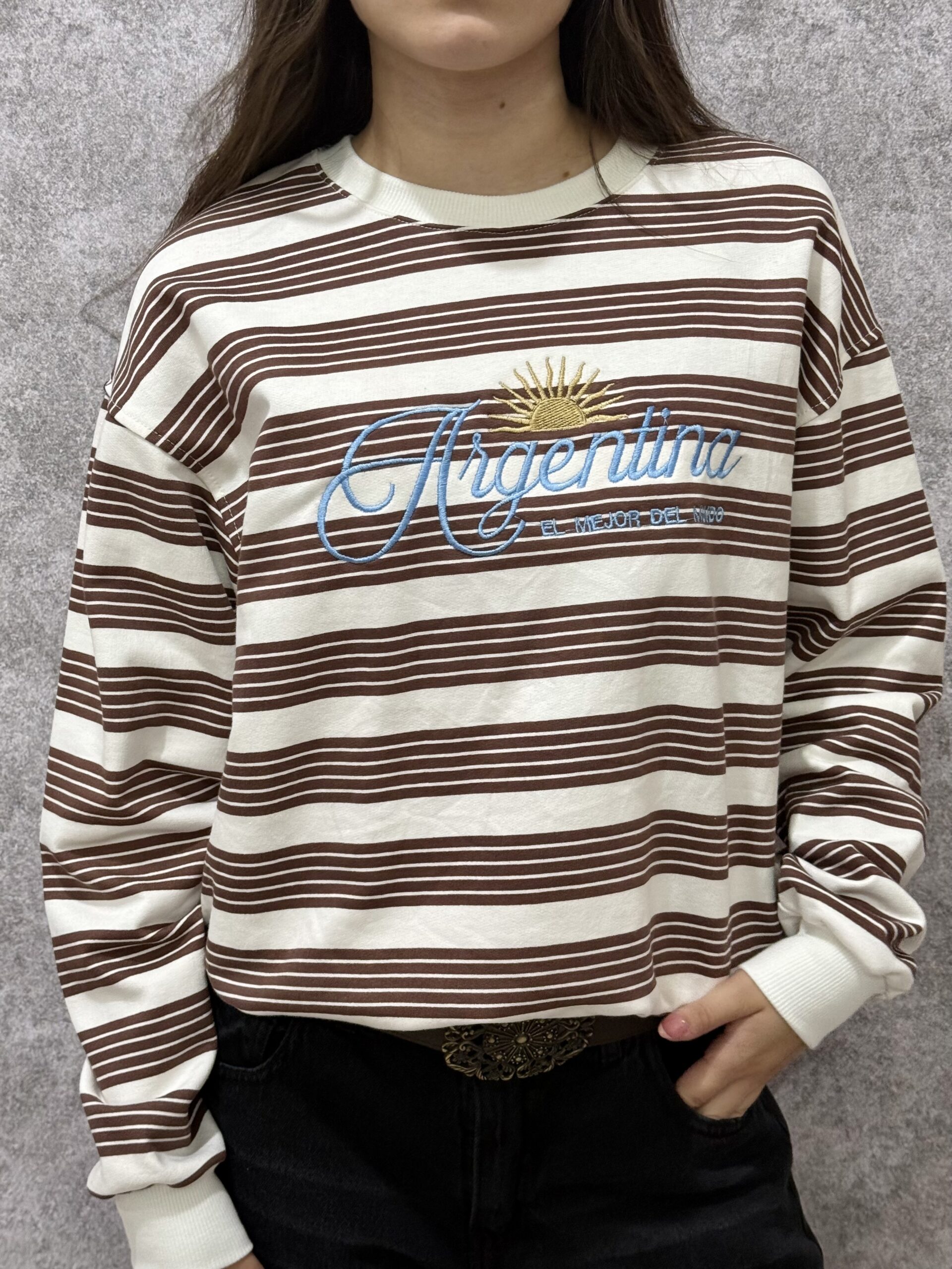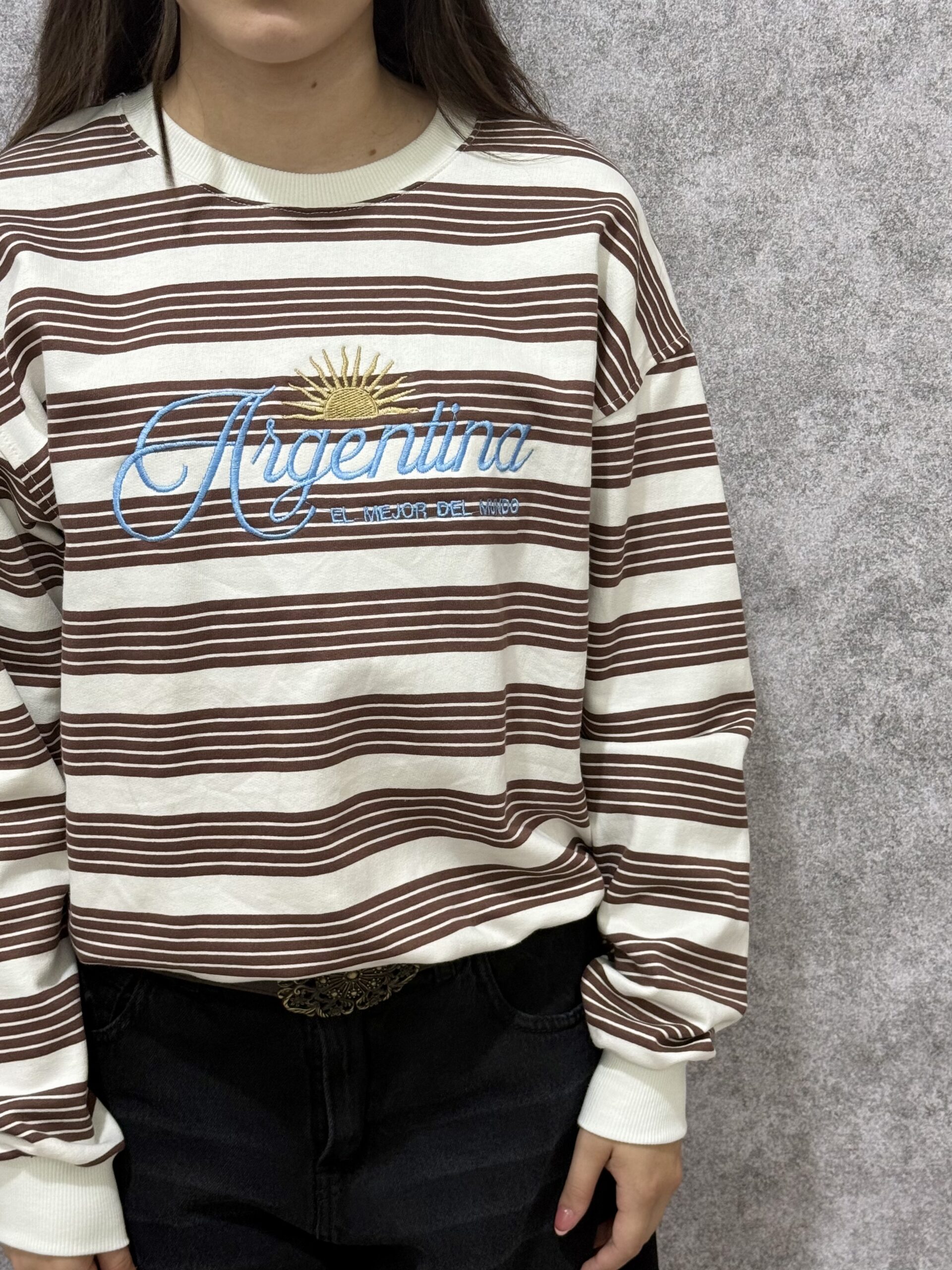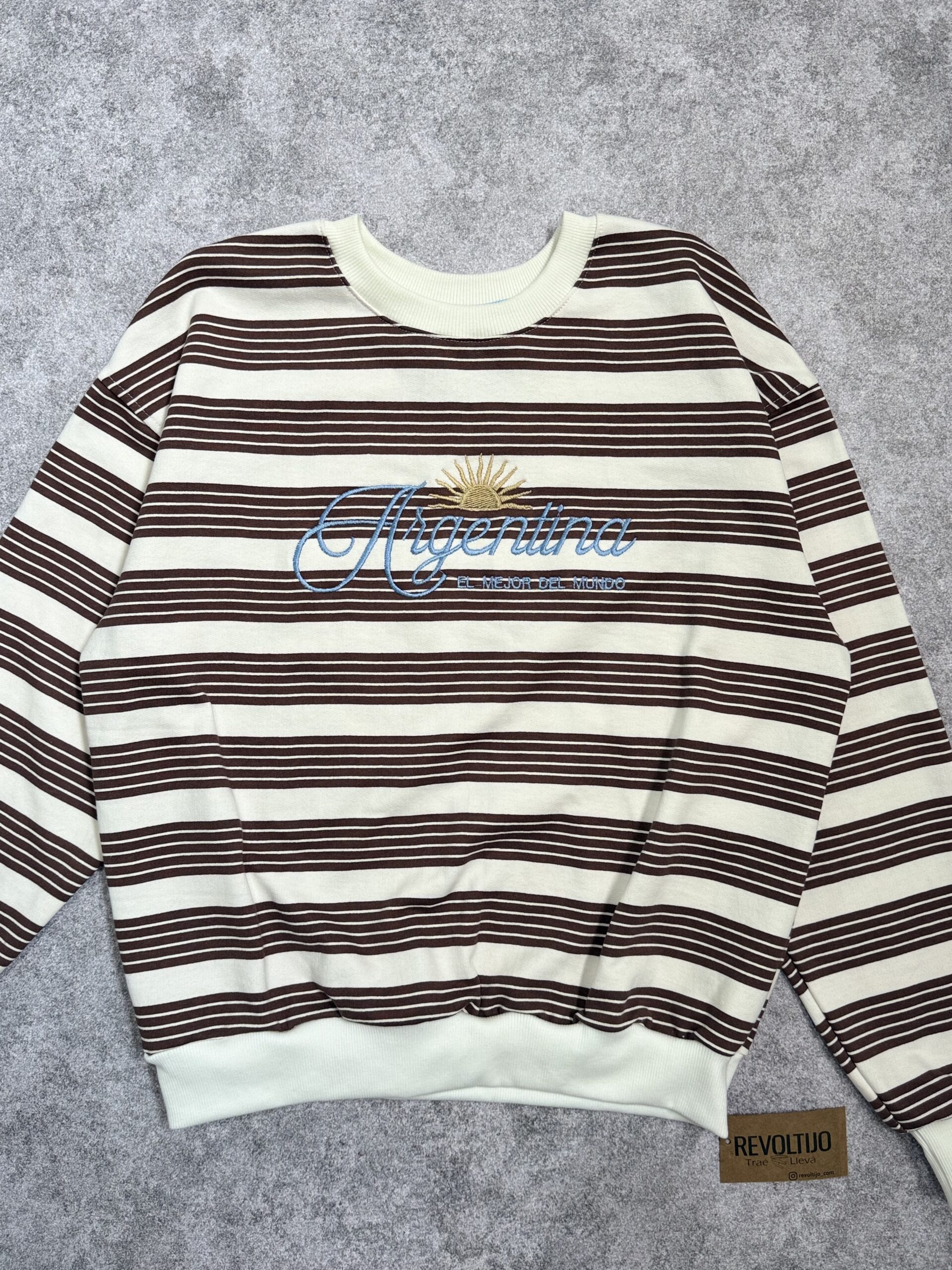 Buzo de diseño urbano y relajado, confeccionado en frisa suave con un patrón de rayas horizontales en marrón y blanco. Destaca por su bordado central temático, convirtiéndose en una prenda con identidad propia, ideal para un look casual diario que combina comodidad y estilo.