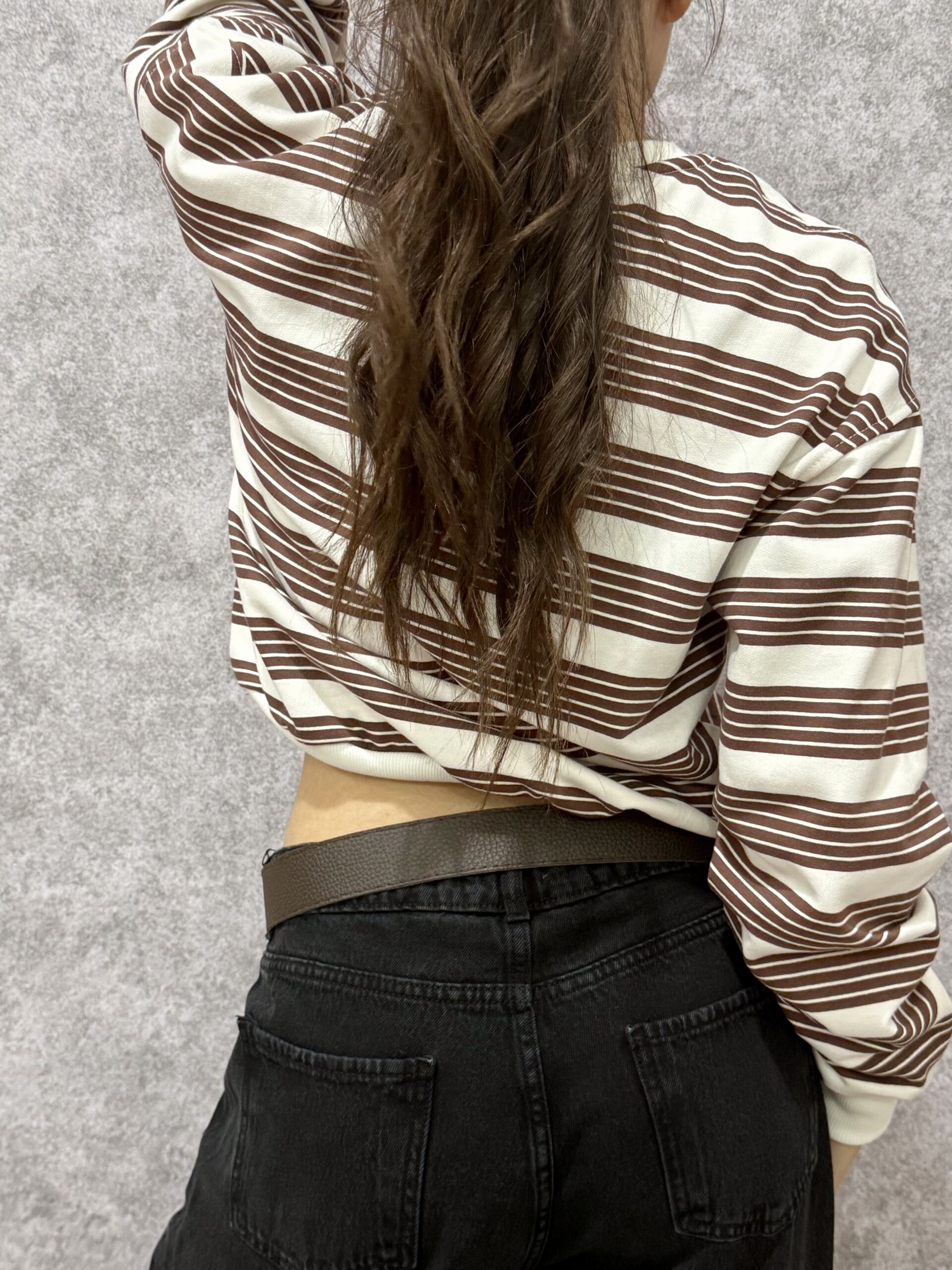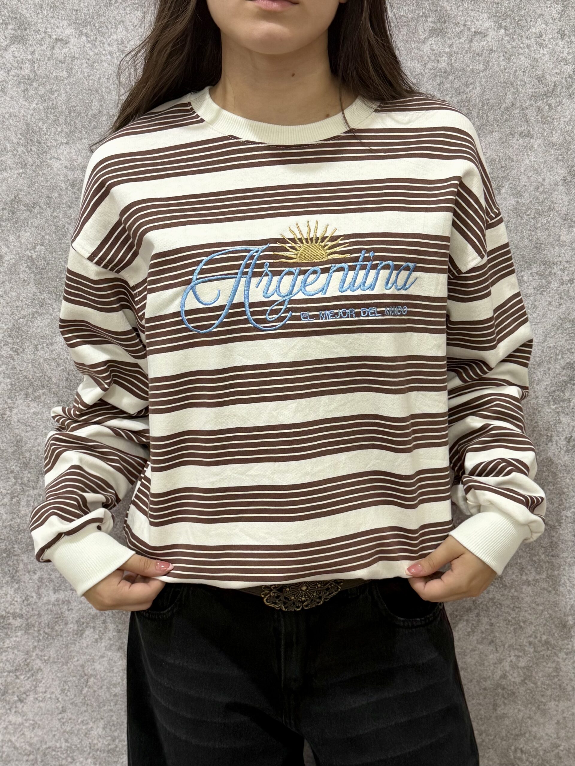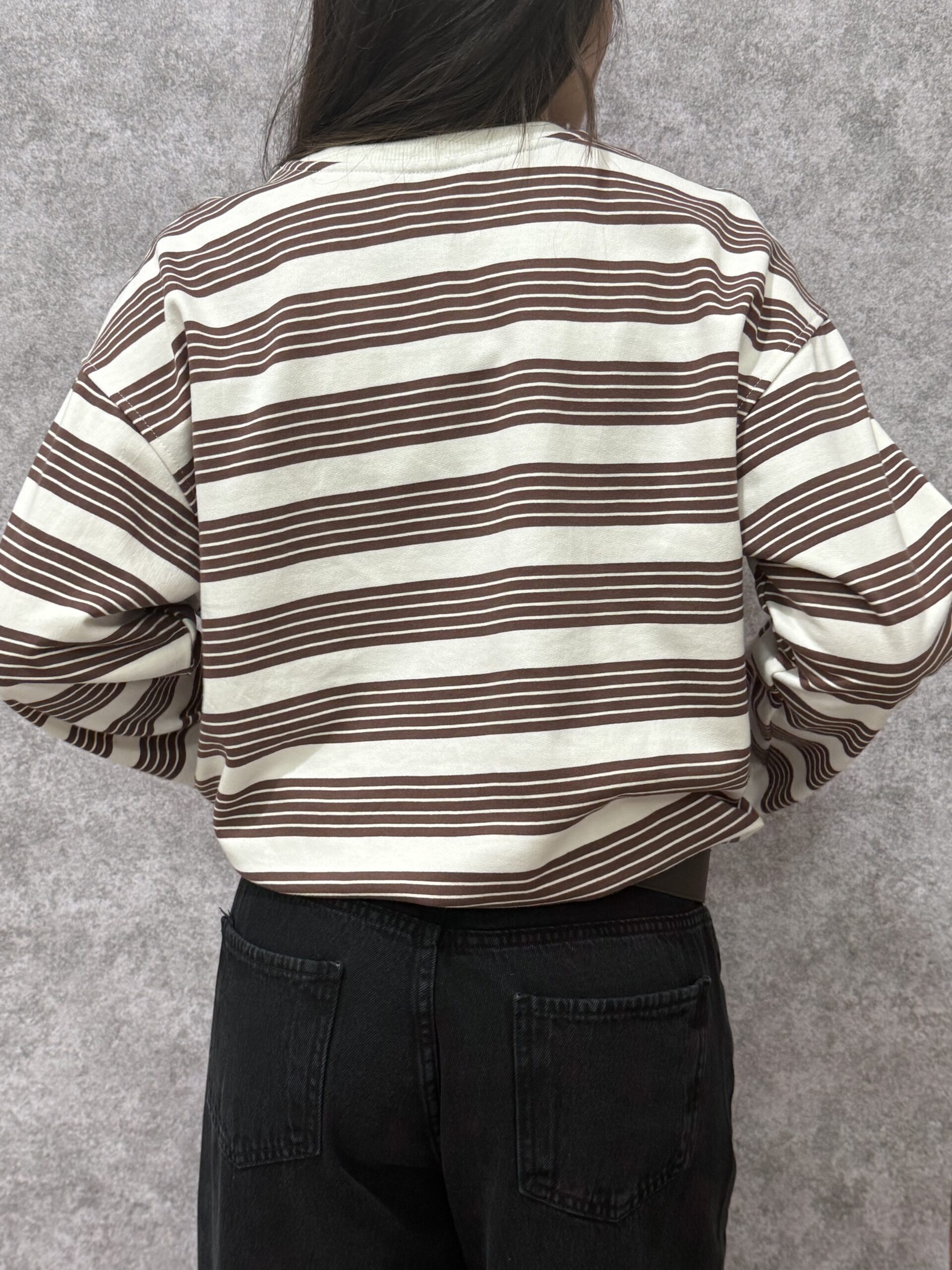 Buzo de diseño urbano y relajado, confeccionado en frisa suave con un patrón de rayas horizontales en marrón y blanco. Destaca por su bordado central temático, convirtiéndose en una prenda con identidad propia, ideal para un look casual diario que combina comodidad y estilo.