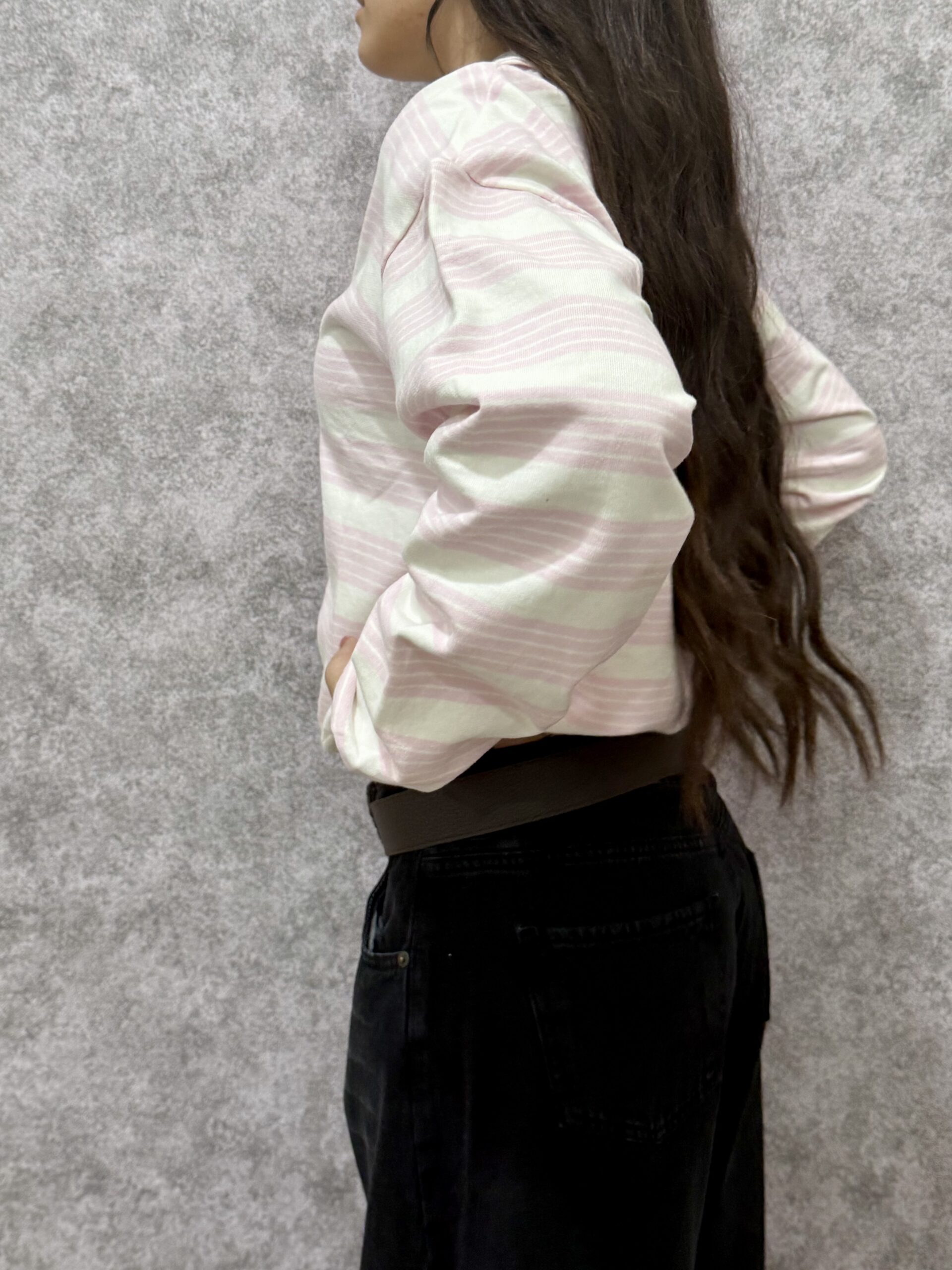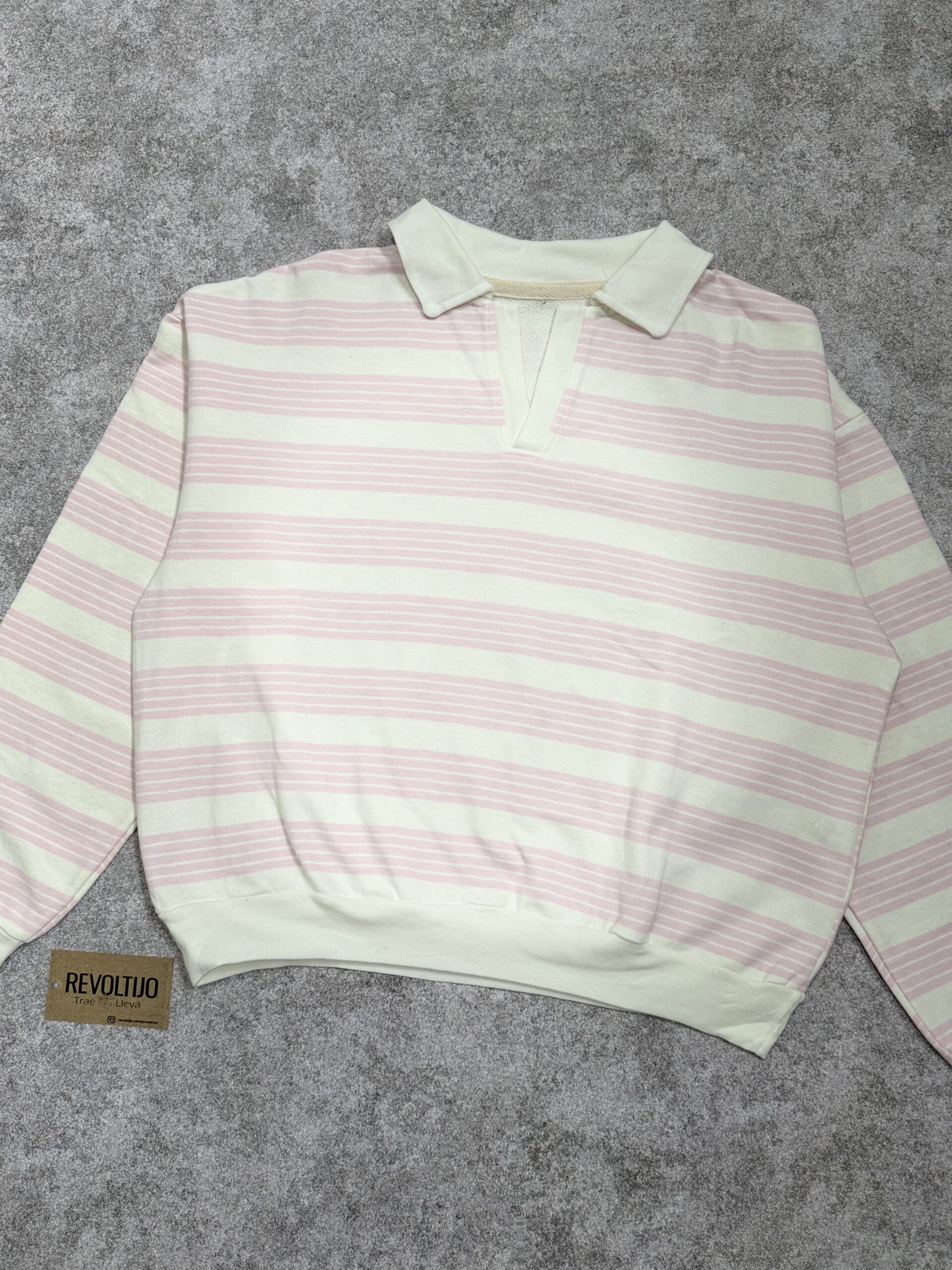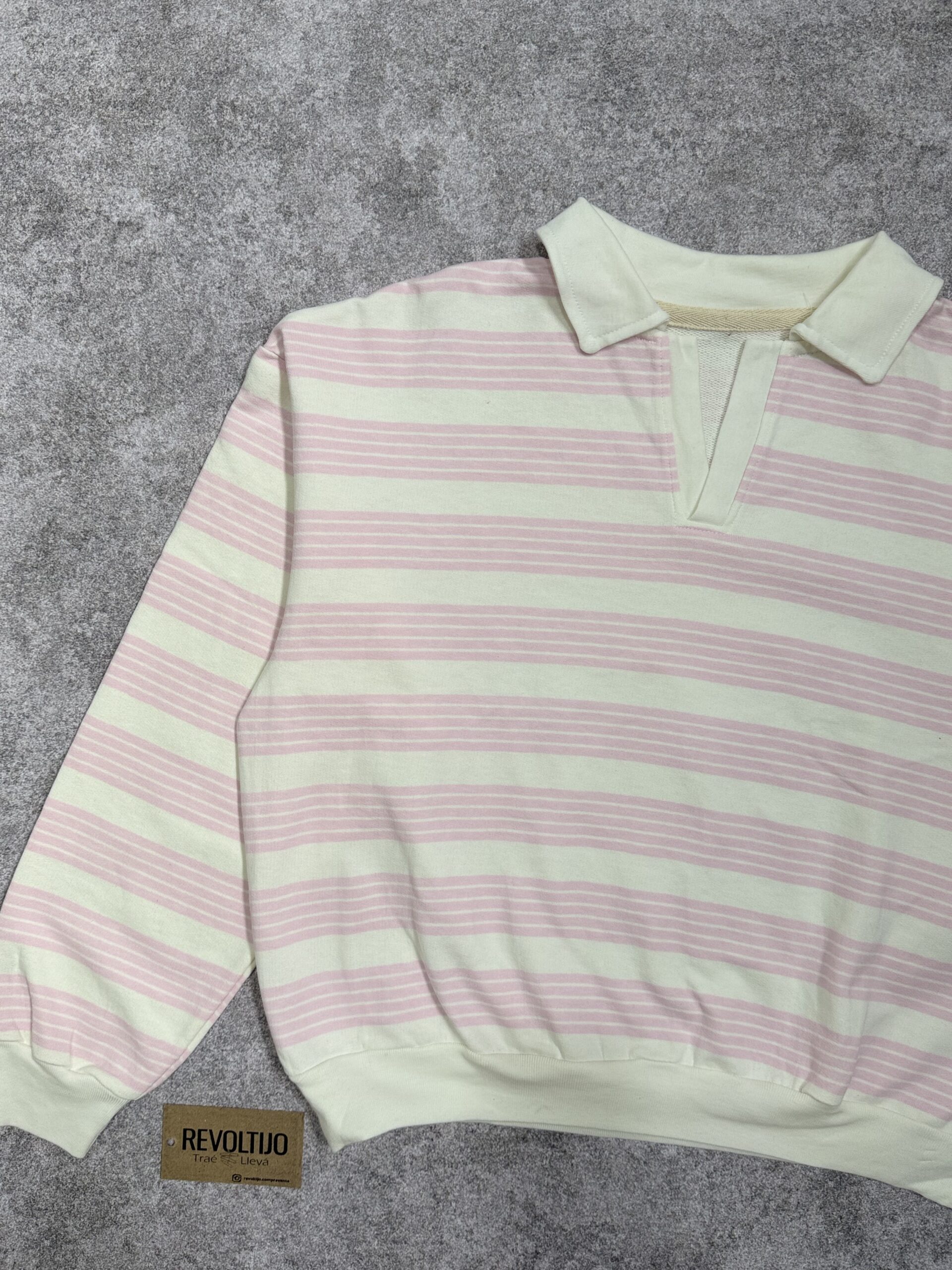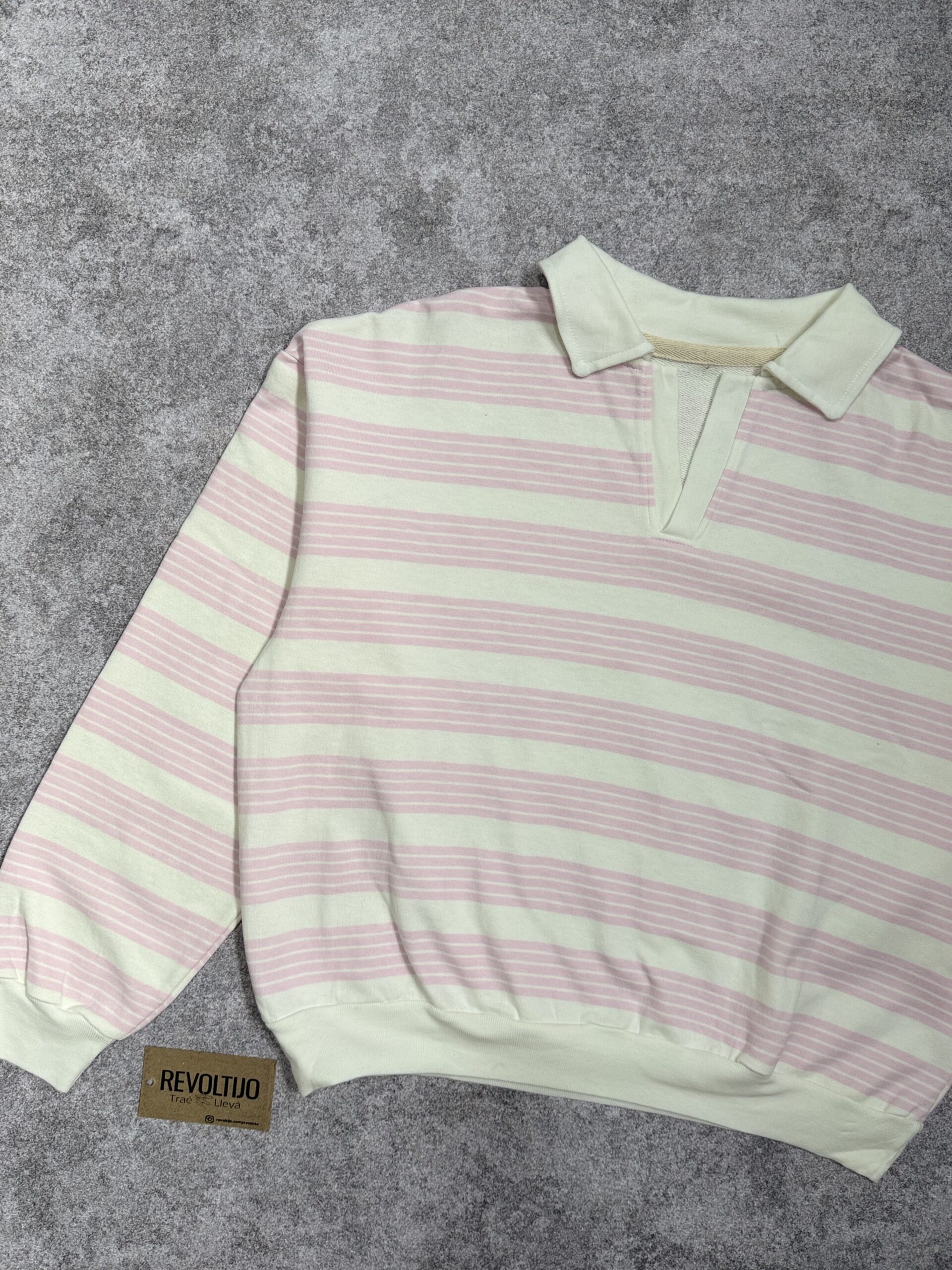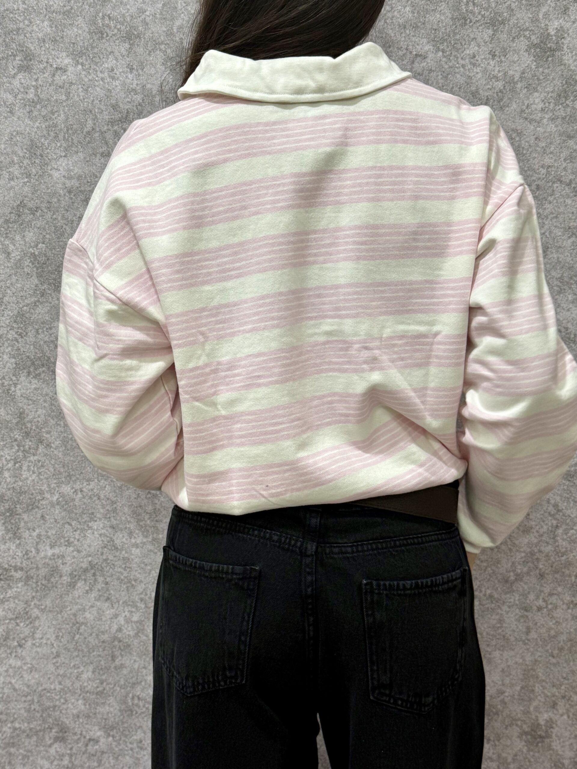 Buzo de corte relajado confeccionado en frisa liviana de alta calidad, con un diseño clásico de rayas horizontales en tonos rosa y blanco. Una prenda versátil de estilo preppy, ideal para lograr un look casual y cómodo sin perder el toque de diseño.