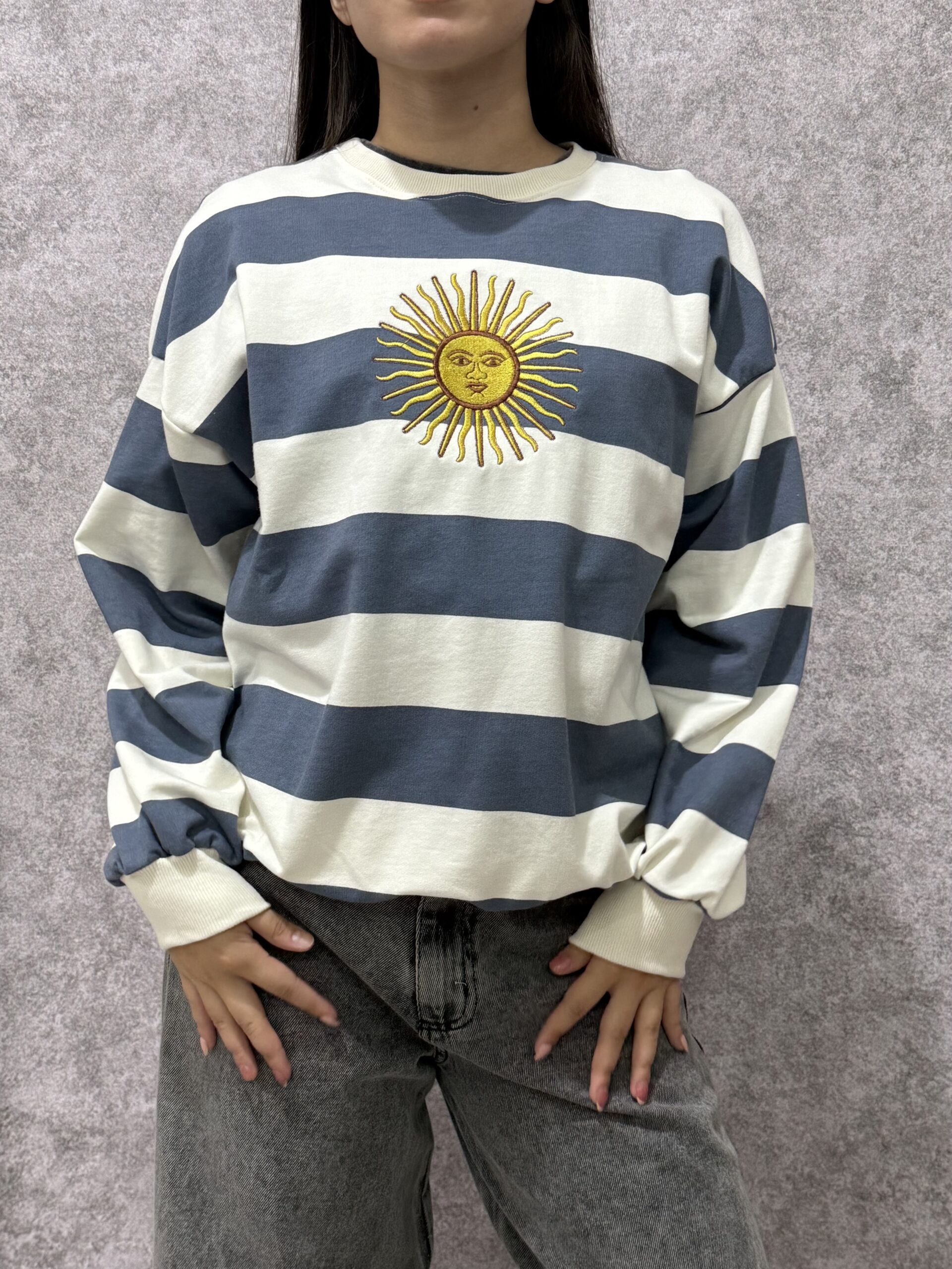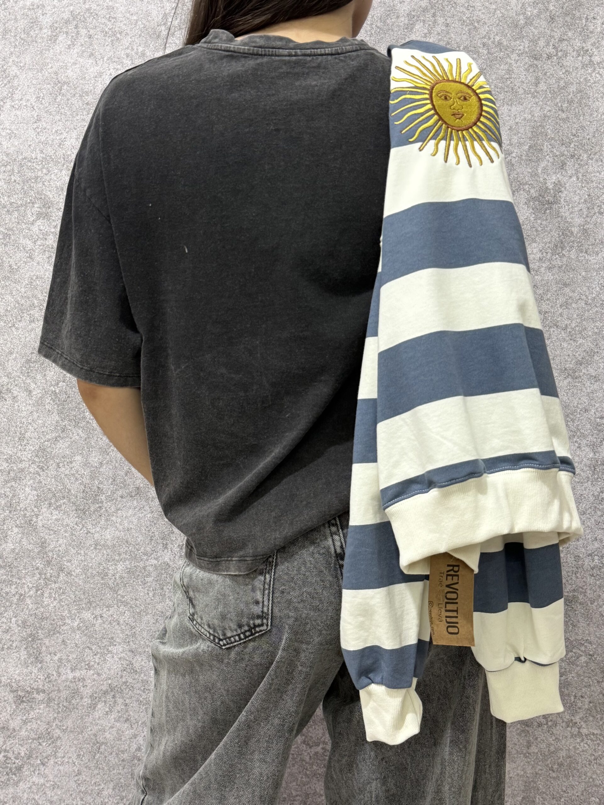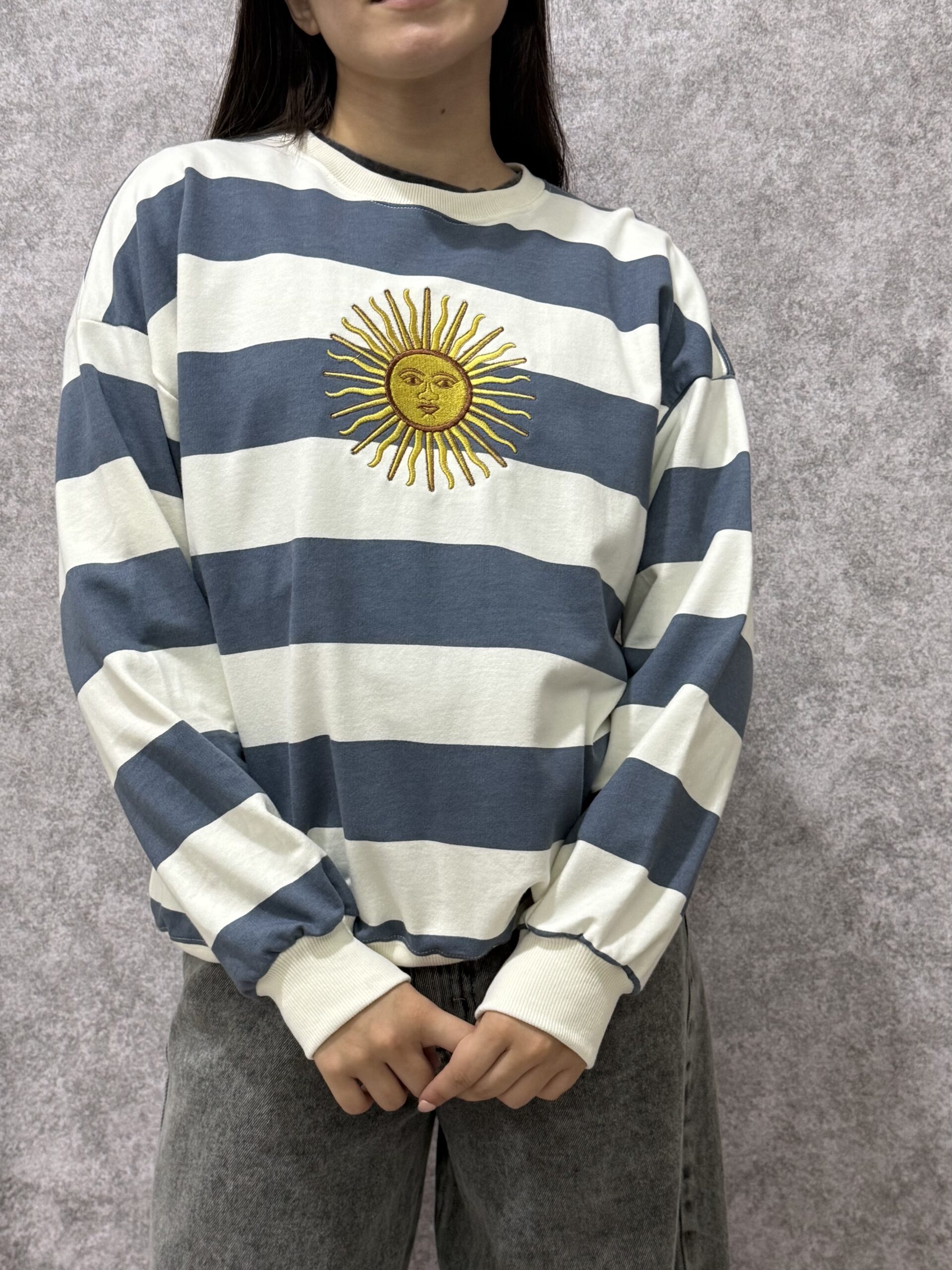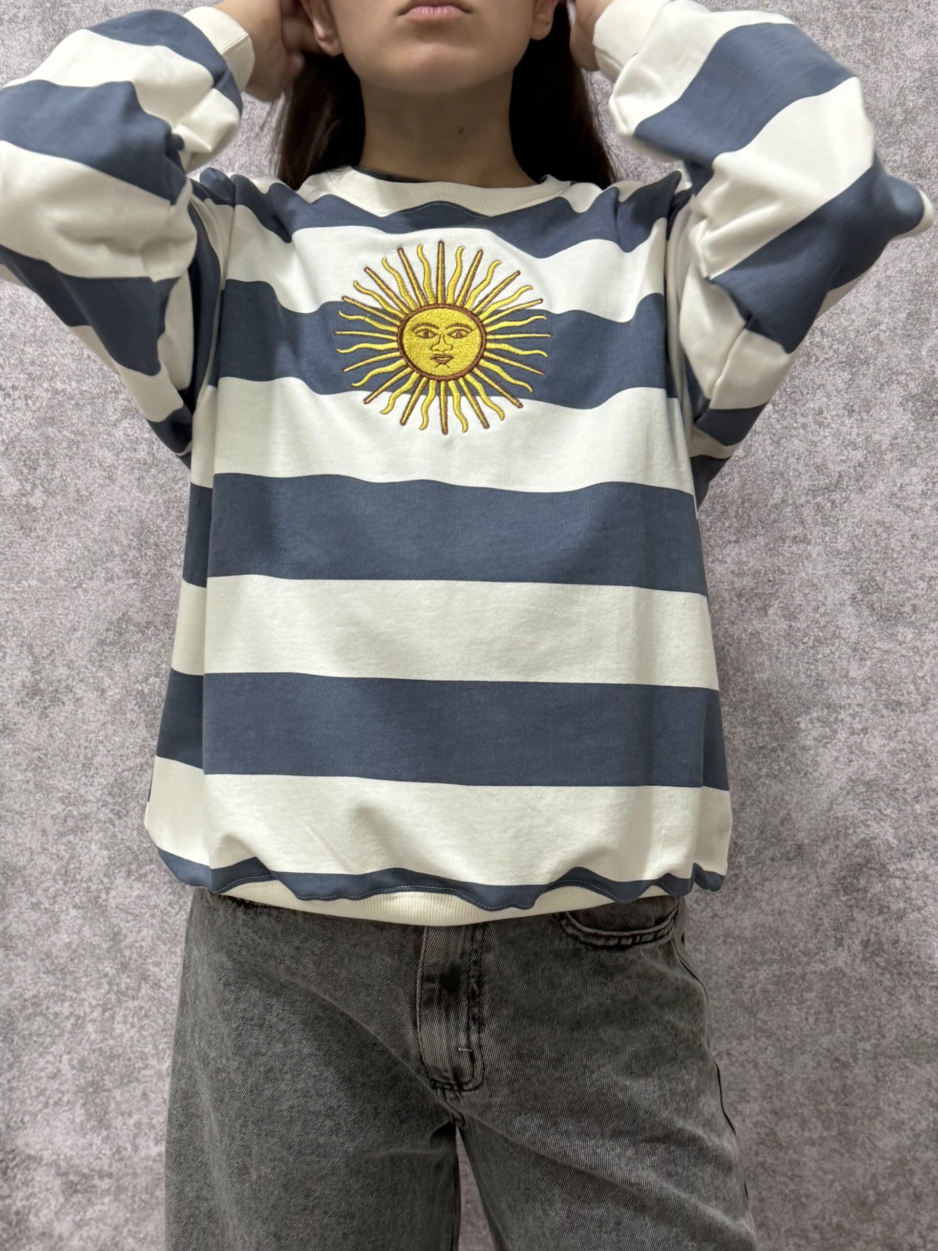 Buzo de diseño relajado y nostálgico, confeccionado en frisa suave con un patrón de rayas horizontales en contraste. Su bordado central rinde homenaje a la identidad nacional con un estilo moderno, convirtiéndolo en una prenda abrigada, cómoda y con un fuerte impacto visual para el uso diario.