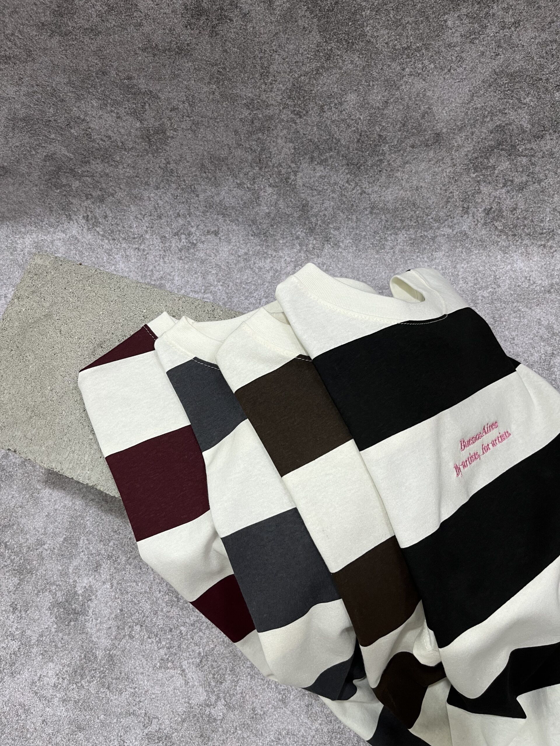 Detalle Distintivo: Rayas horizontales anchas en bloques de color negro, marrón, bordó o gris y blanco hueso, con un bordado central en hilo fucsia o rosa neón de la frase «Buenos Aires» en tipografía cursiva.