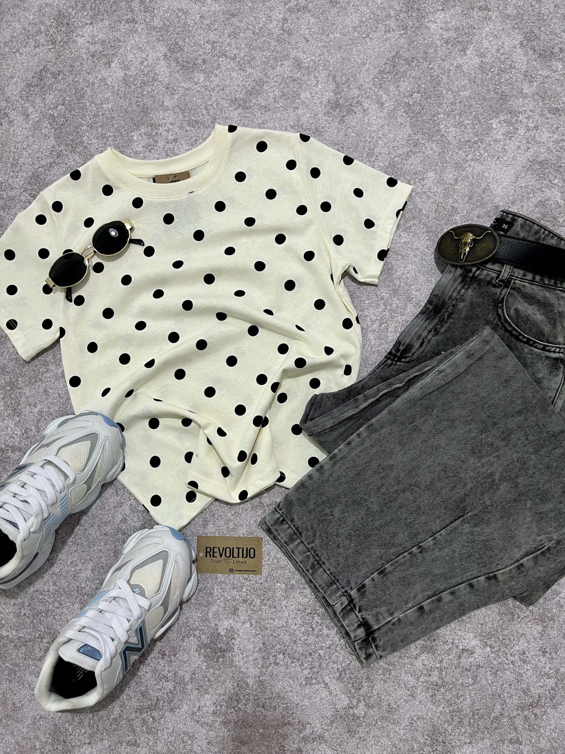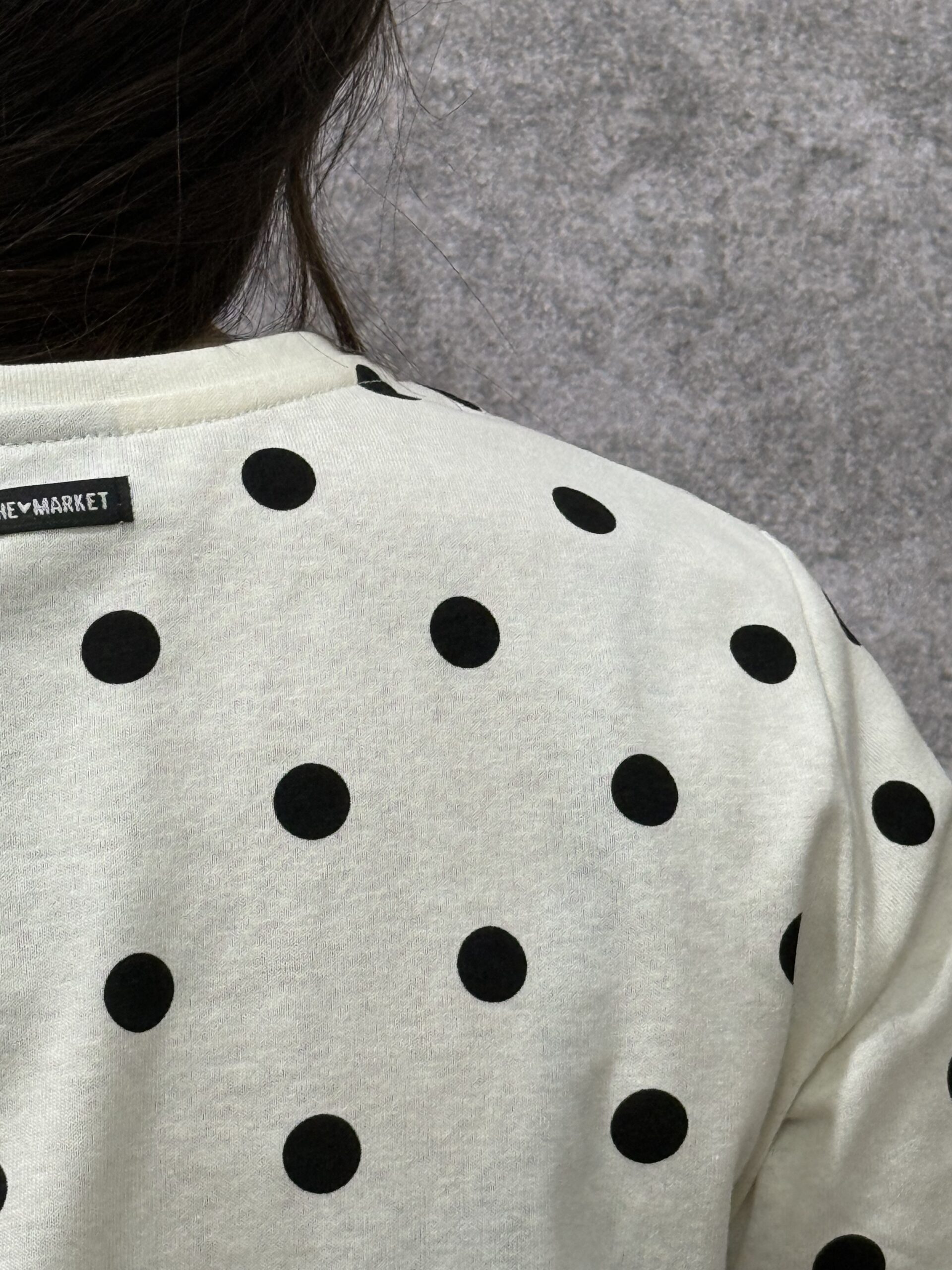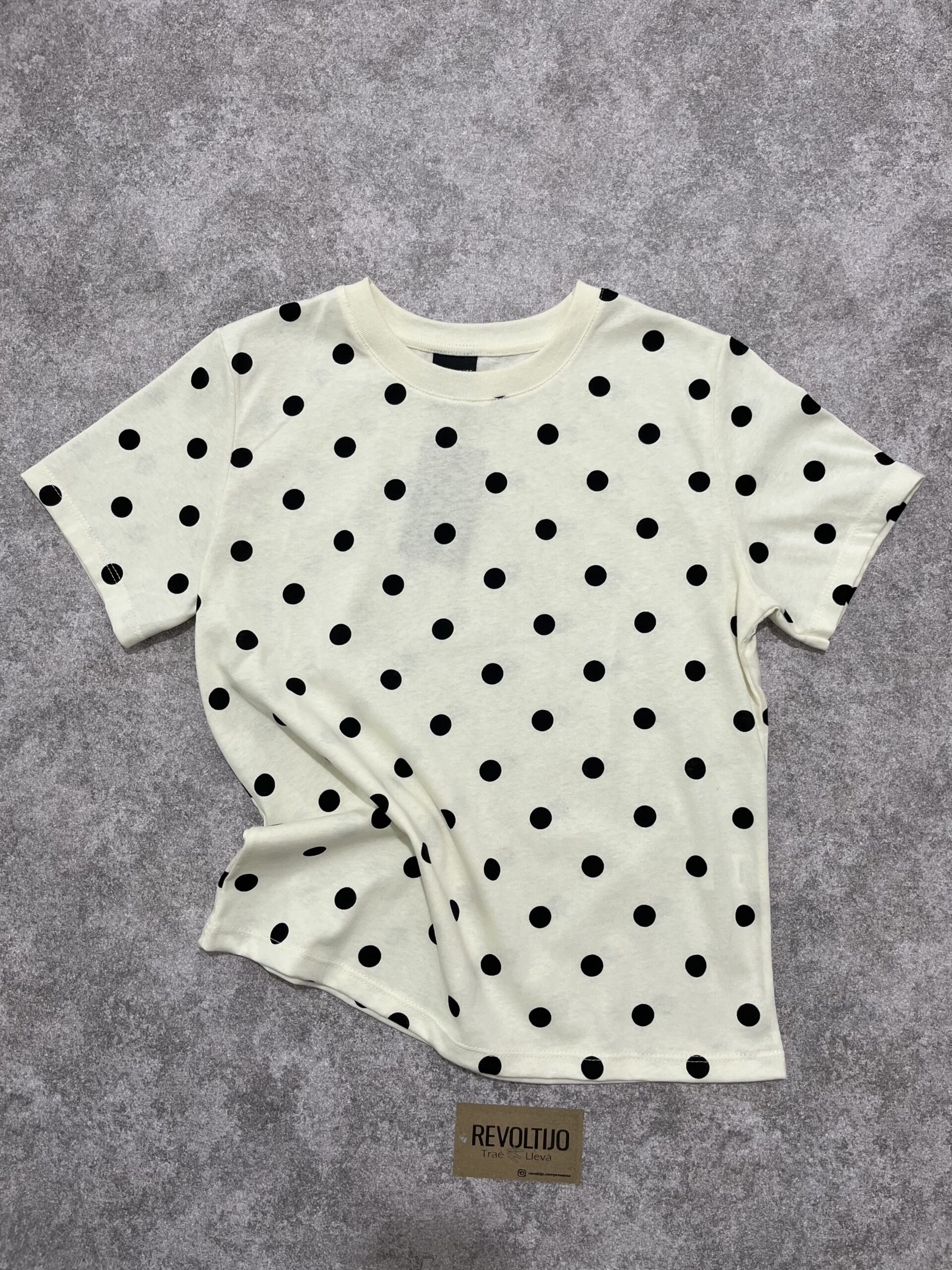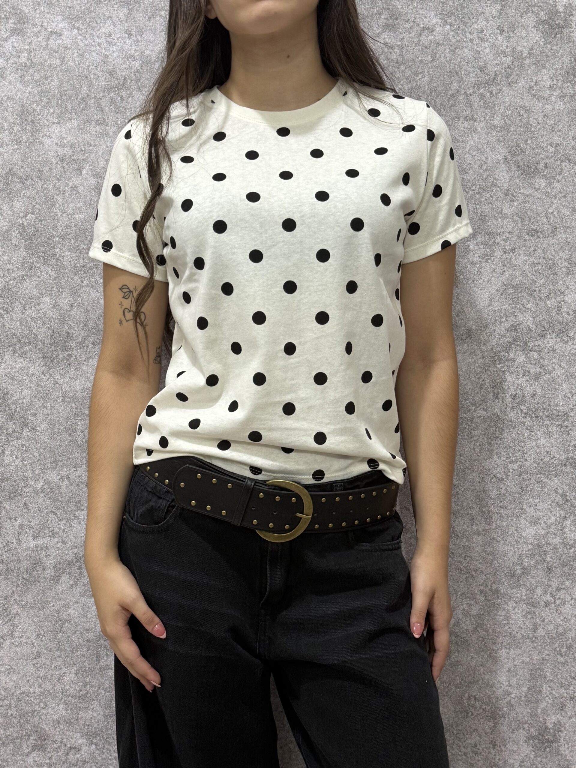 Remera de diseño clásico y femenino, confeccionada en jersey de algodón suave con un estampado atemporal de lunares. Es una prenda básica con personalidad, ideal para aportar un toque retro y delicado a cualquier conjunto diario, manteniendo la frescura y la comodidad en todo momento.