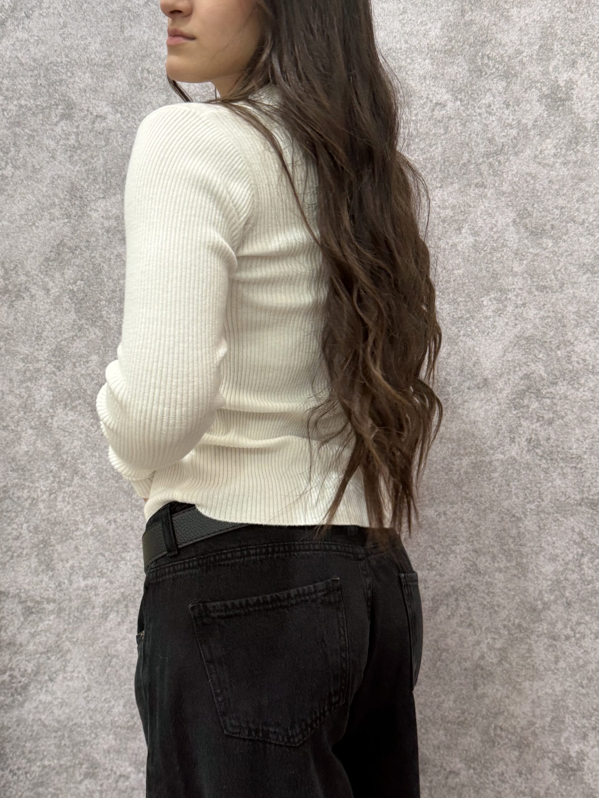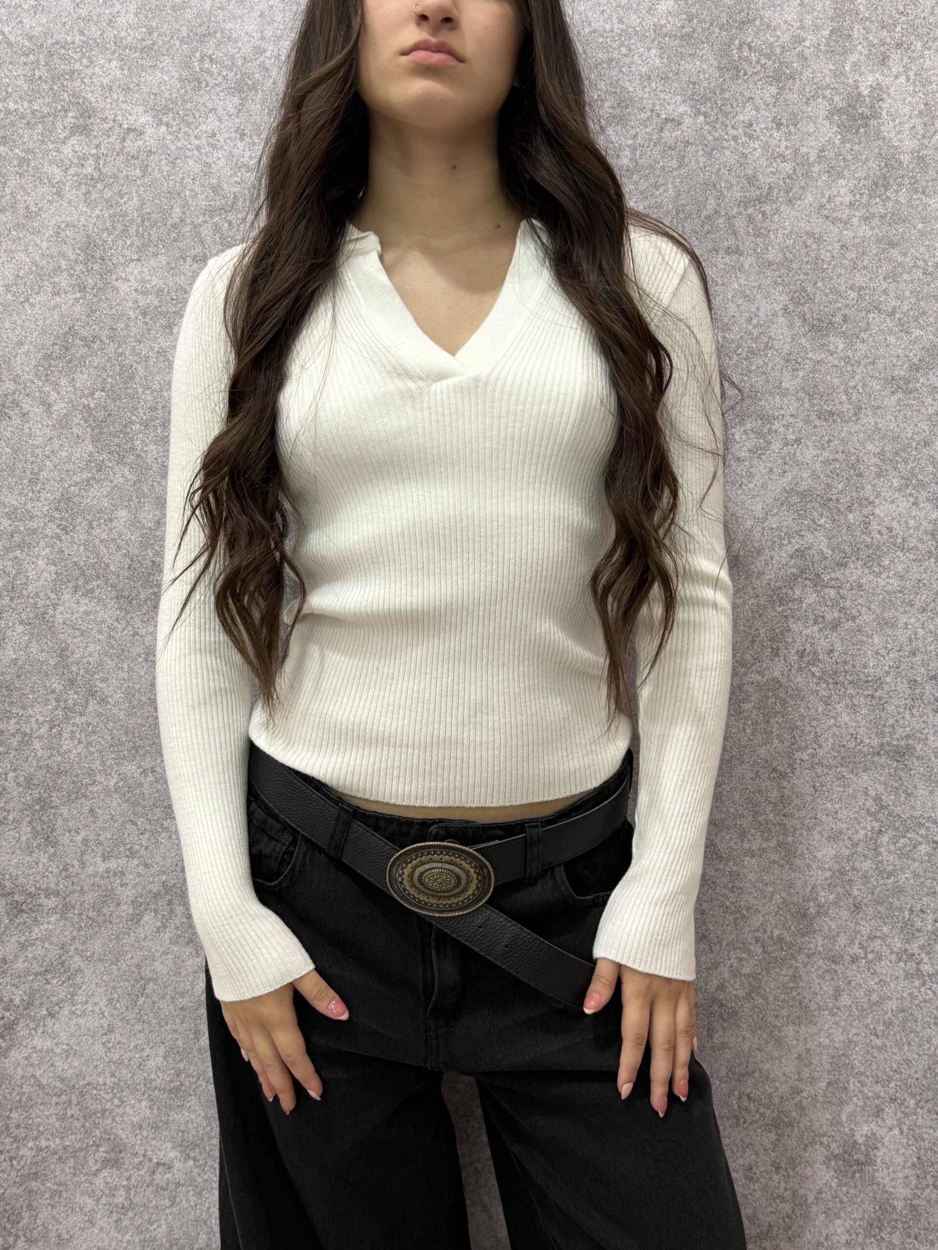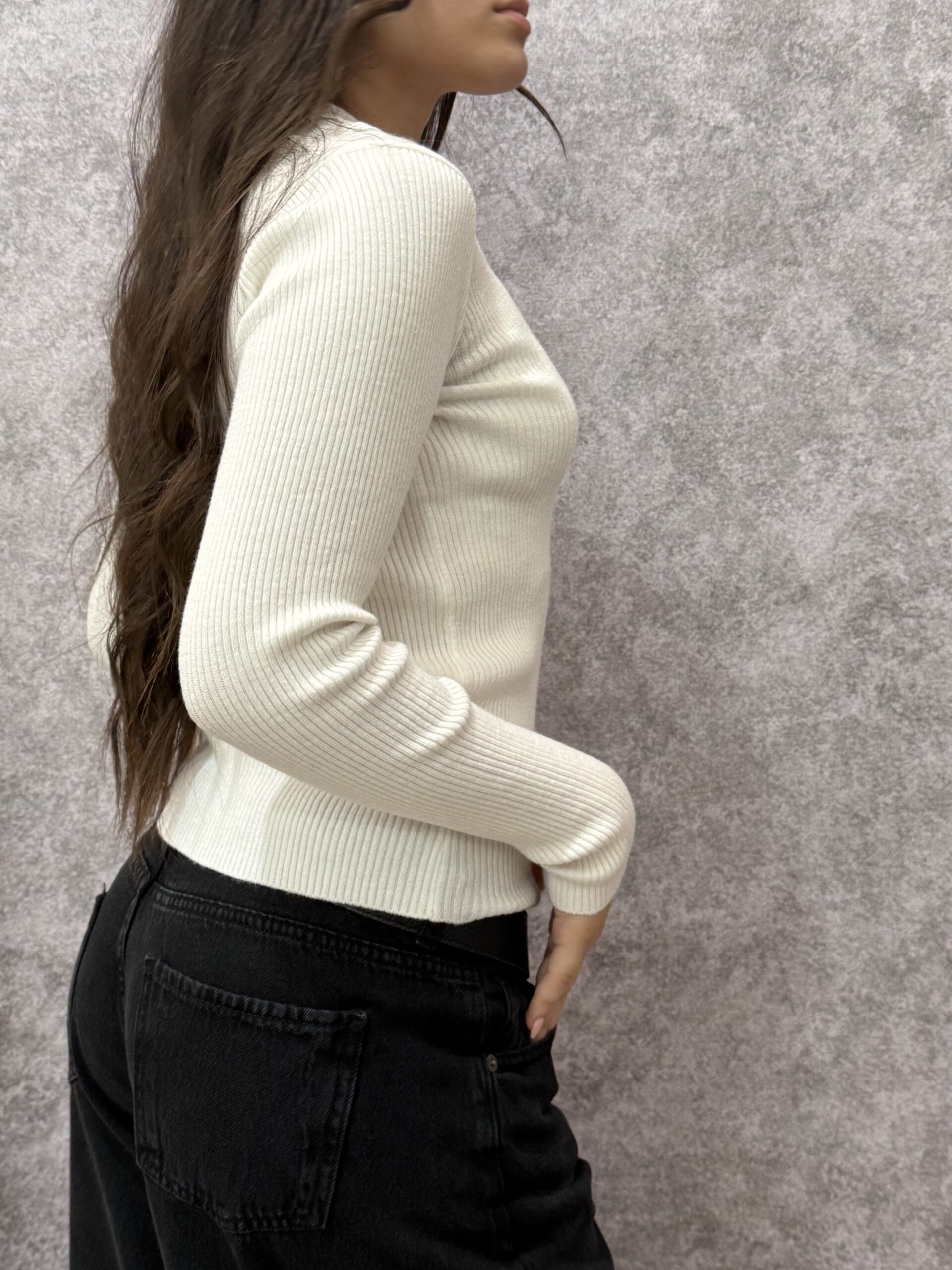 Sweater de punto clásico y textura sumamente suave, diseñado para brindar calidez y confort sin perder la elegancia. Su tono blanco lo convierte en un básico imprescindible y versátil, ideal para armar looks de invierno tanto relajados como formales.