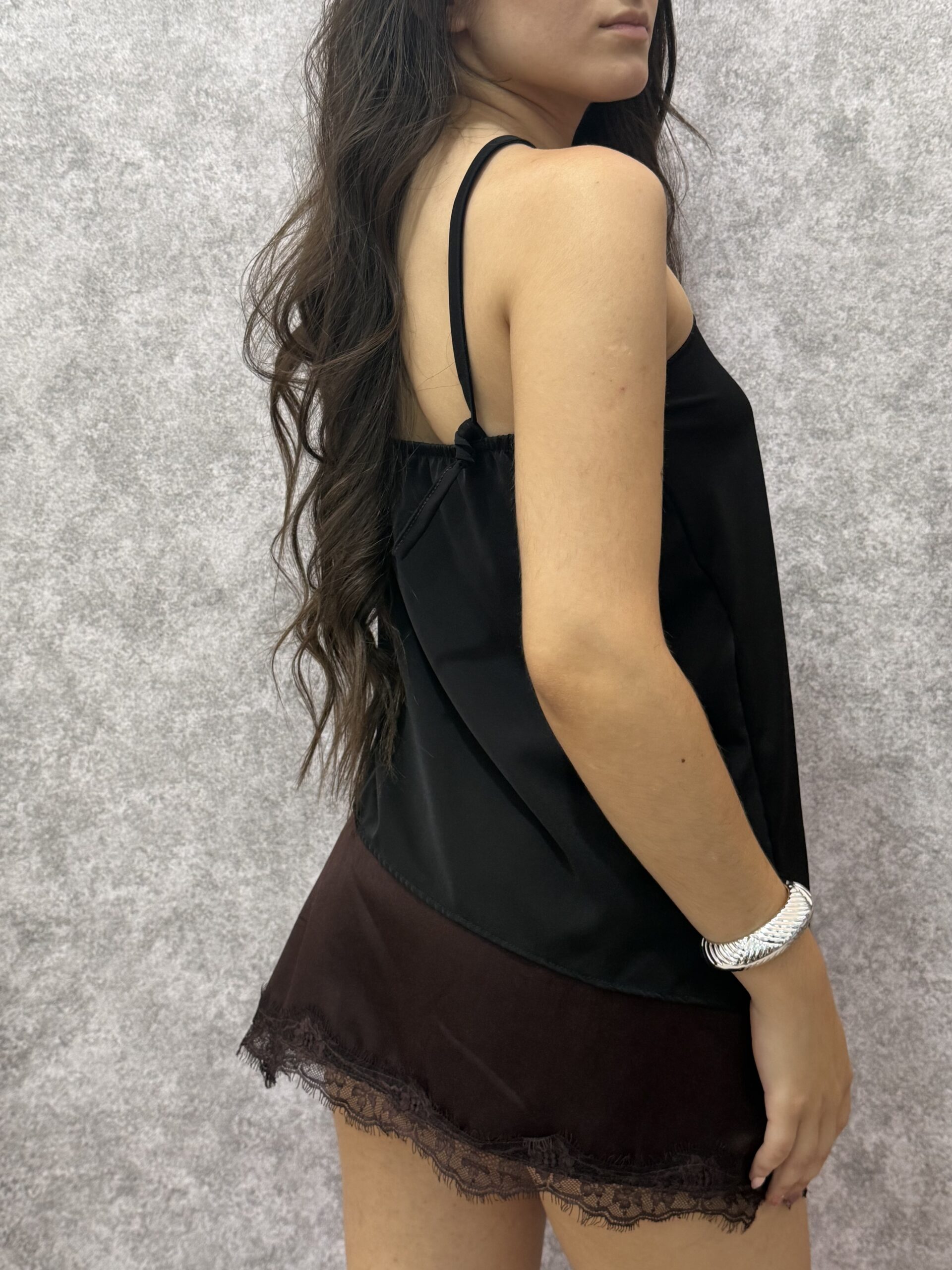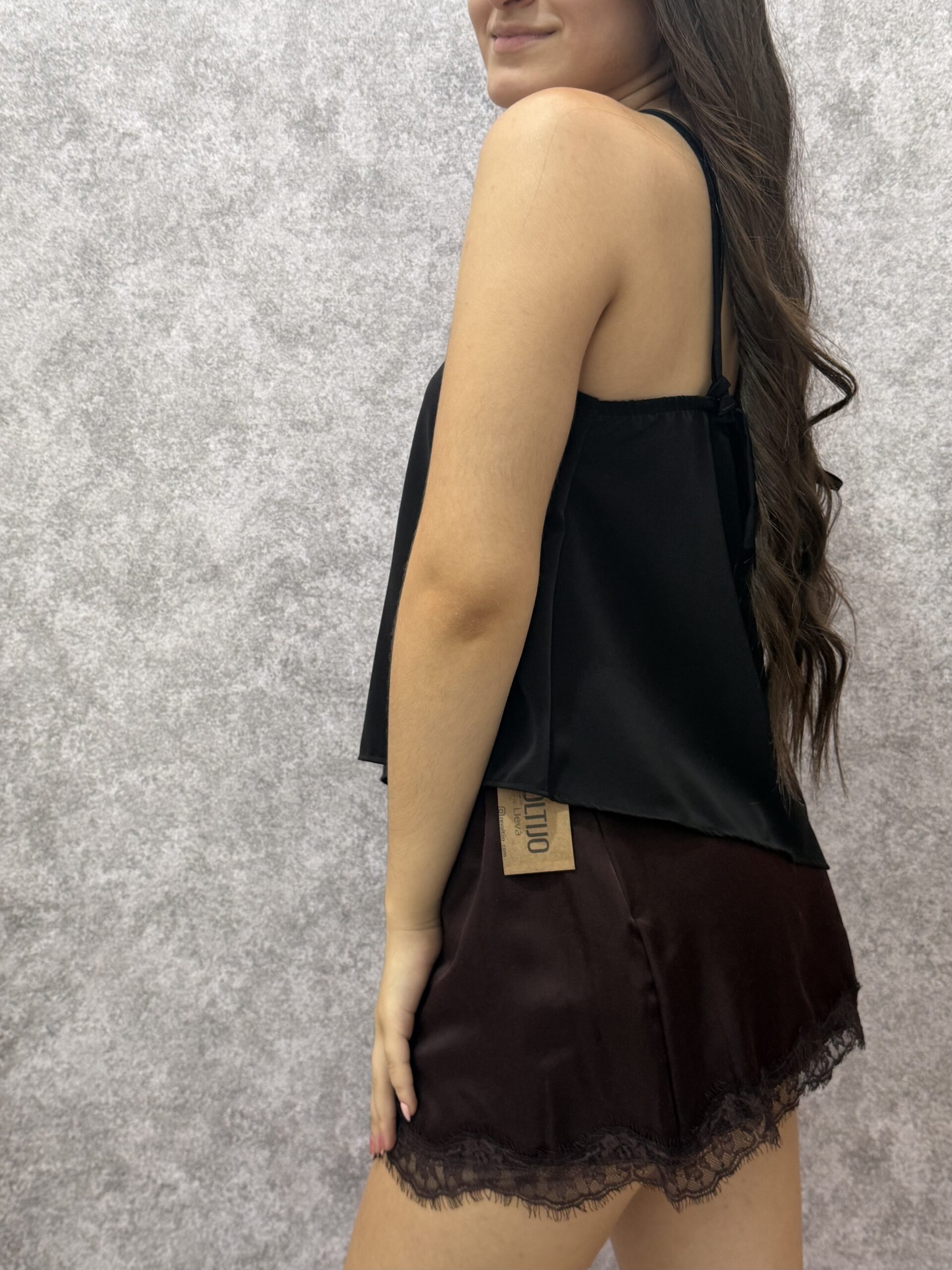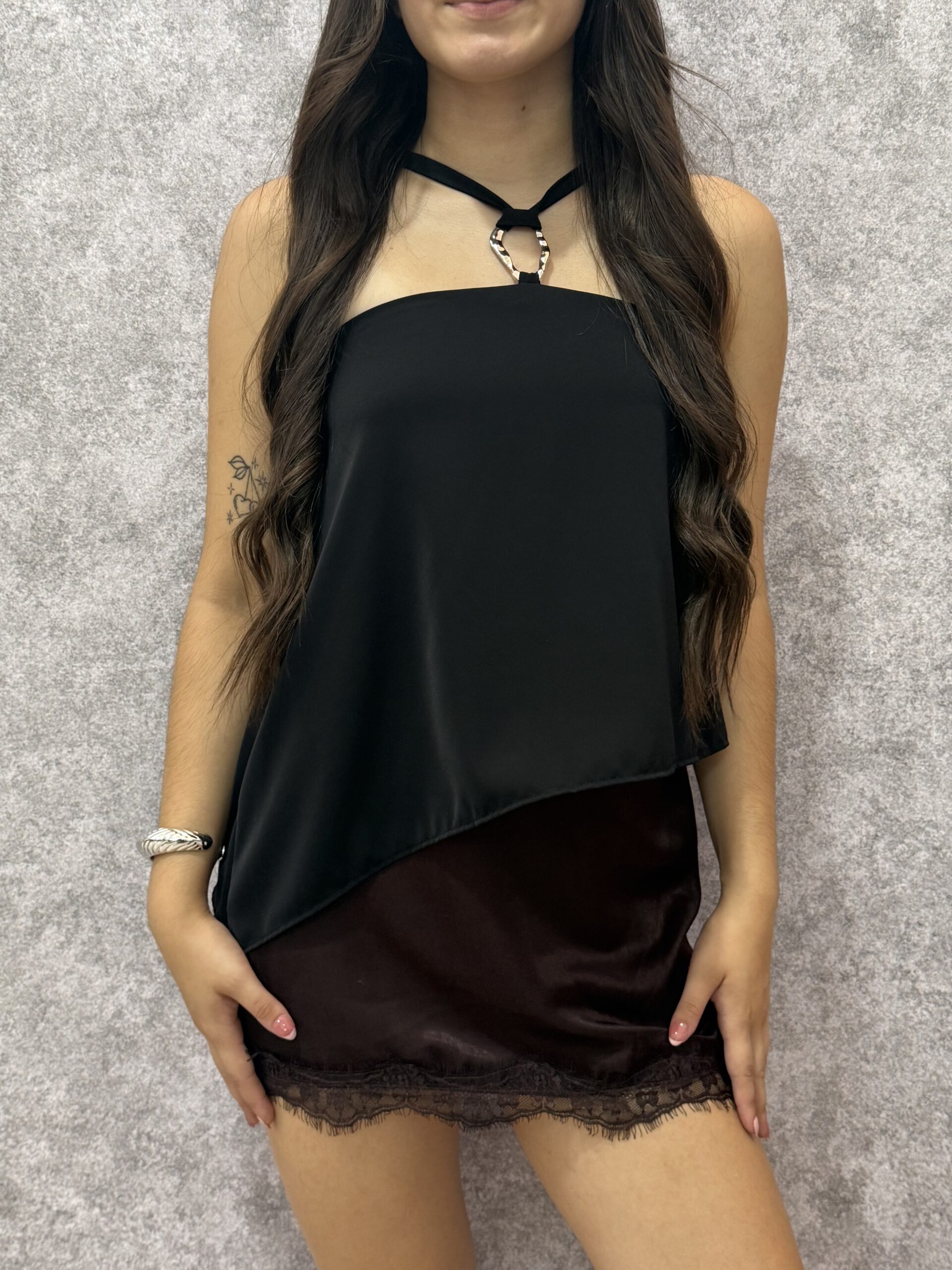 Top de silueta refinada y estructura minimalista, confeccionado en tela de vestibilidad sastrera con excelente cuerpo. Su caída fluida y el detalle metálico lo convierten en una pieza sofisticada y versátil, ideal para armar conjuntos de día o de noche con un toque de diseño sobrio.