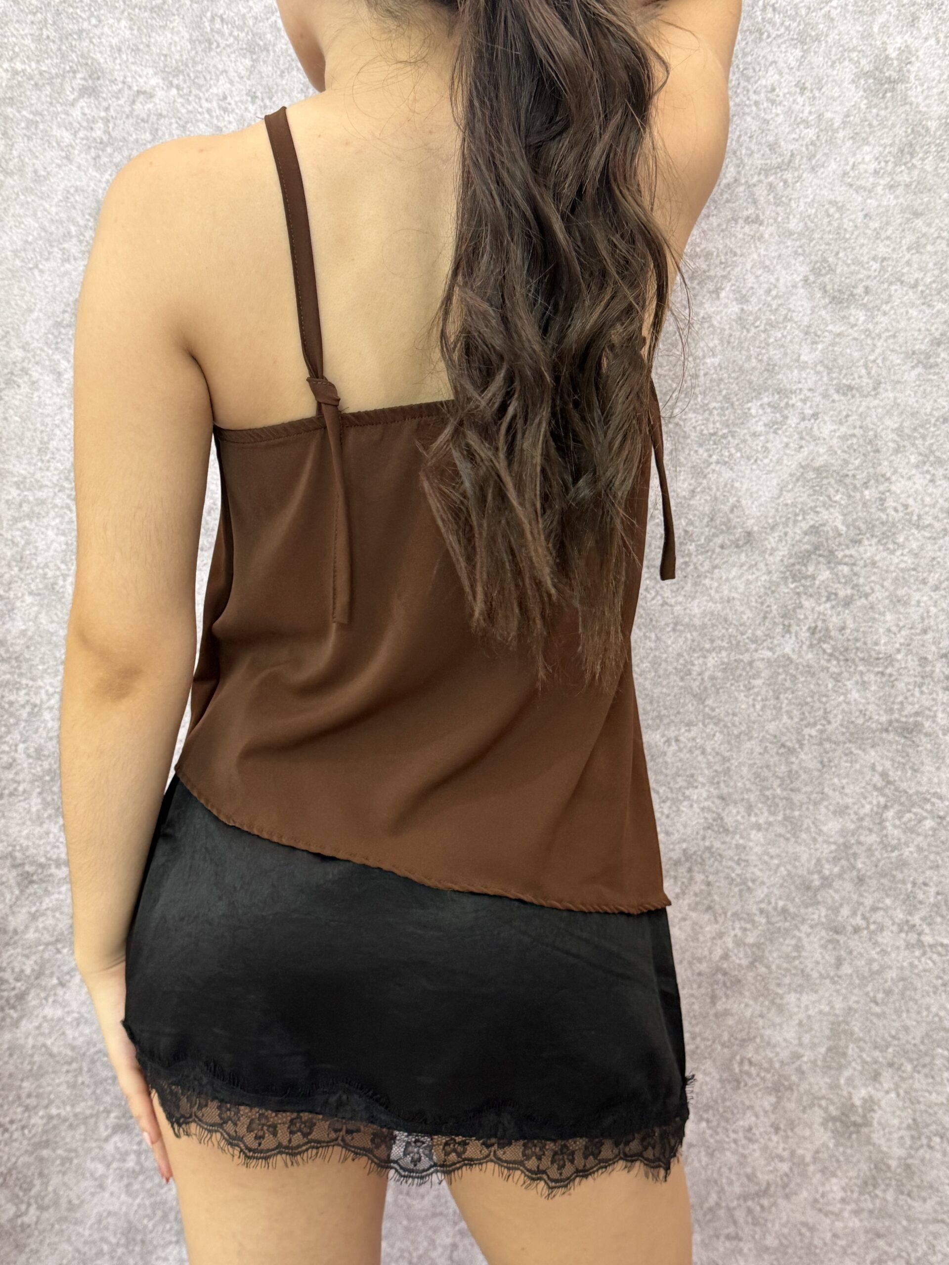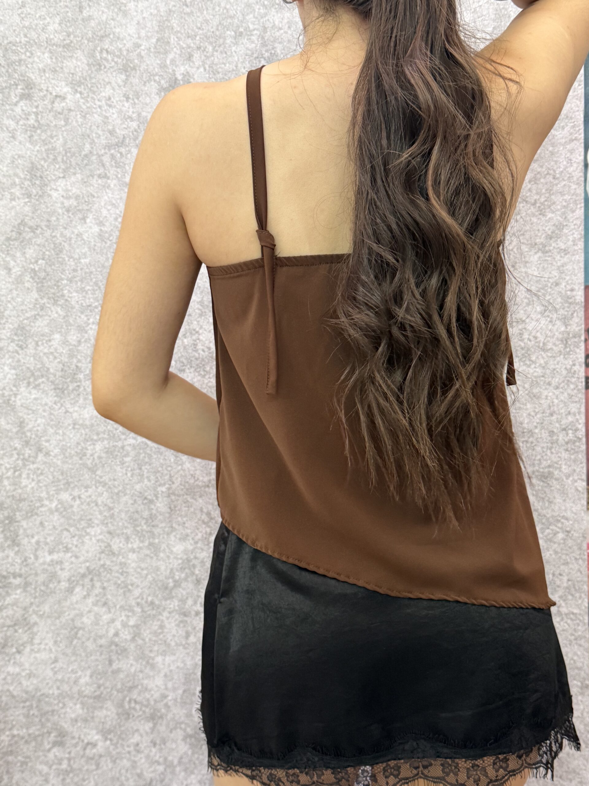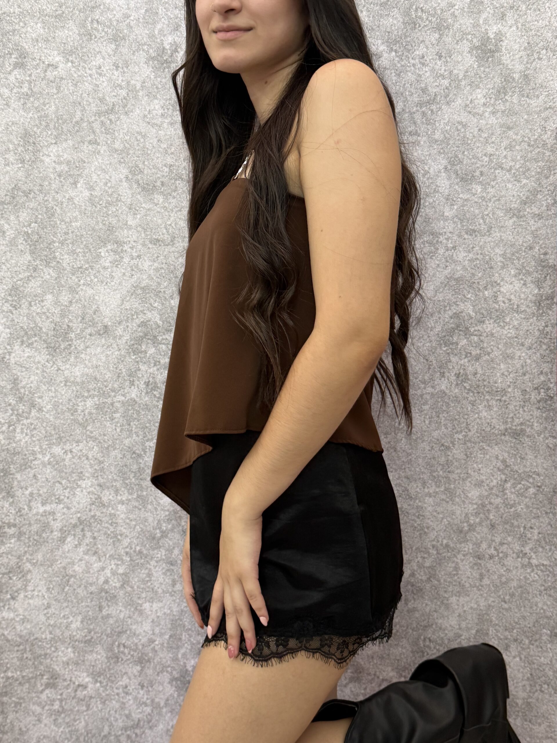 Top de silueta refinada y estructura minimalista, confeccionado en tela de vestibilidad sastrera con excelente cuerpo. Su caída fluida y el detalle metálico lo convierten en una pieza sofisticada y versátil, ideal para armar conjuntos de día o de noche con un toque de diseño sobrio.